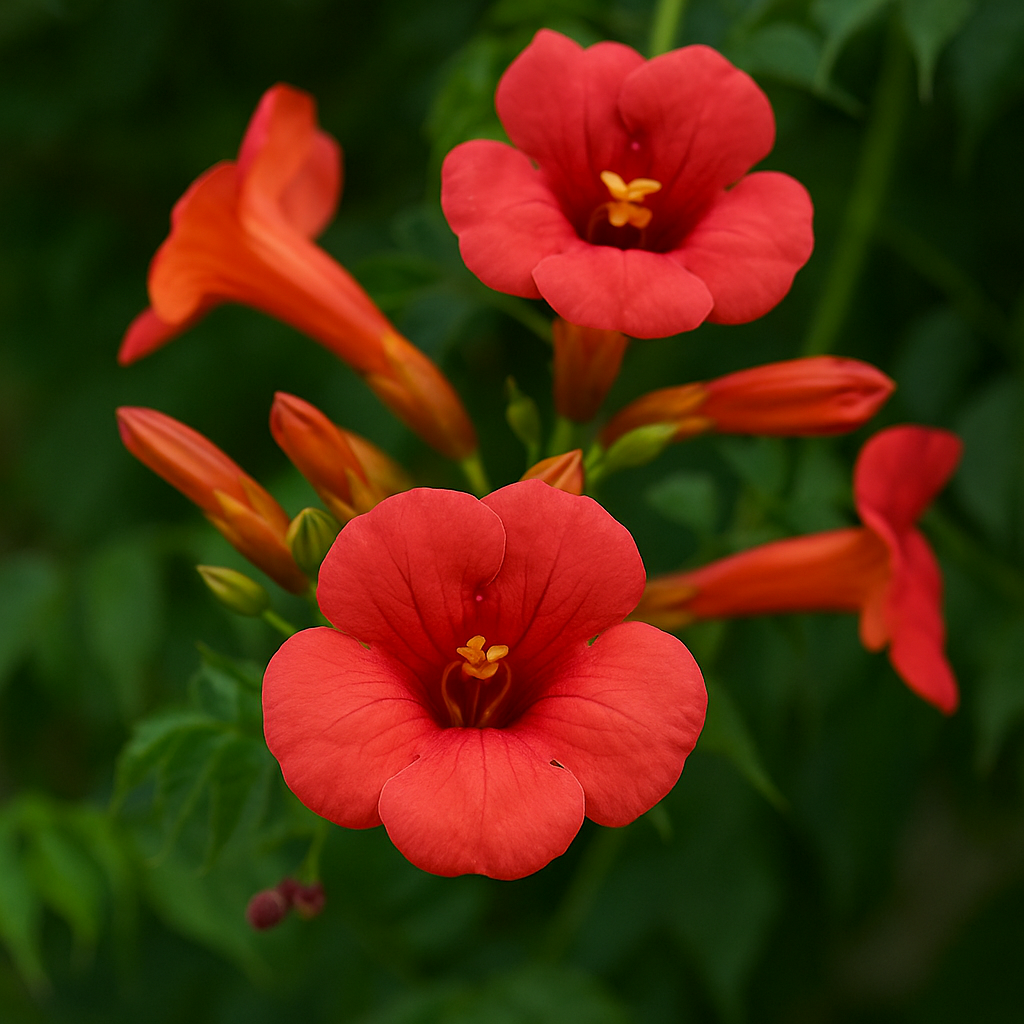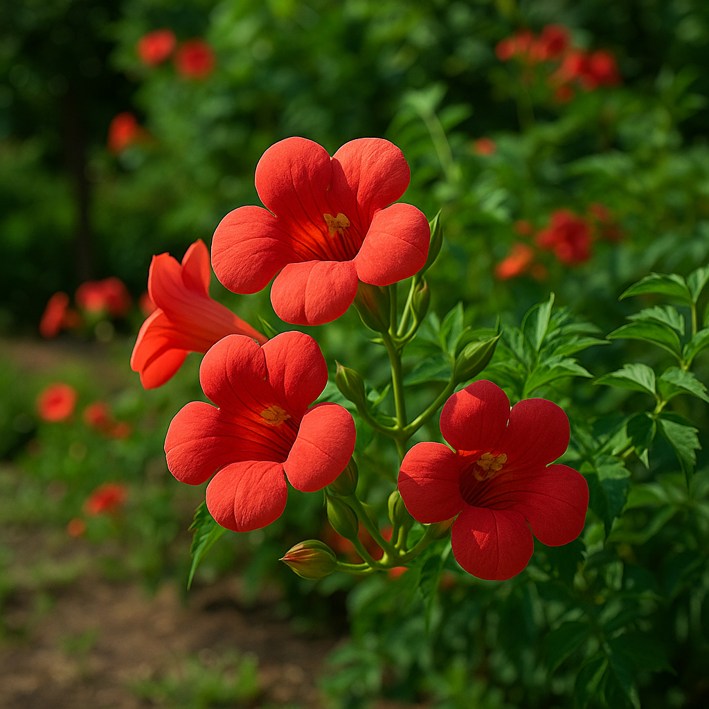 - 붉은꽃능소화: 북미 원산, 꽃은 작지만 번식력과 흡착력이 뛰어남.