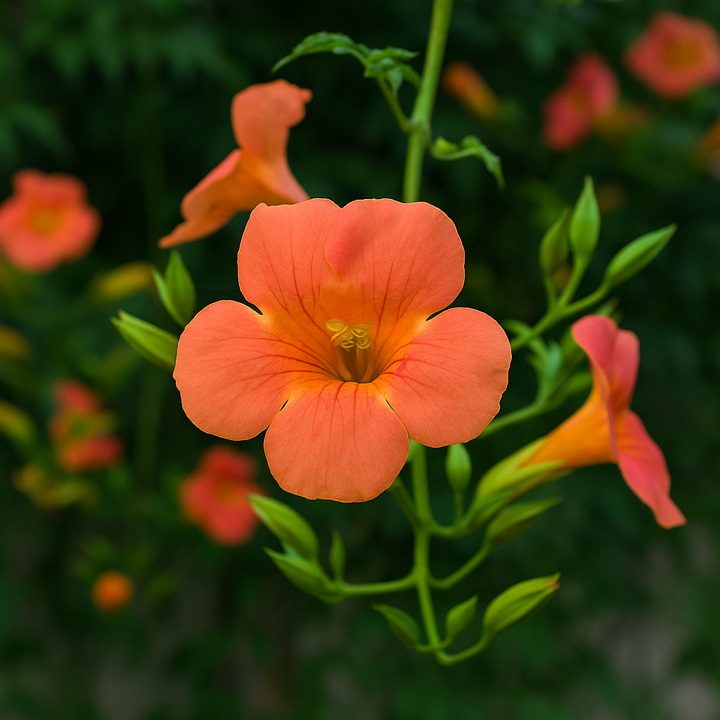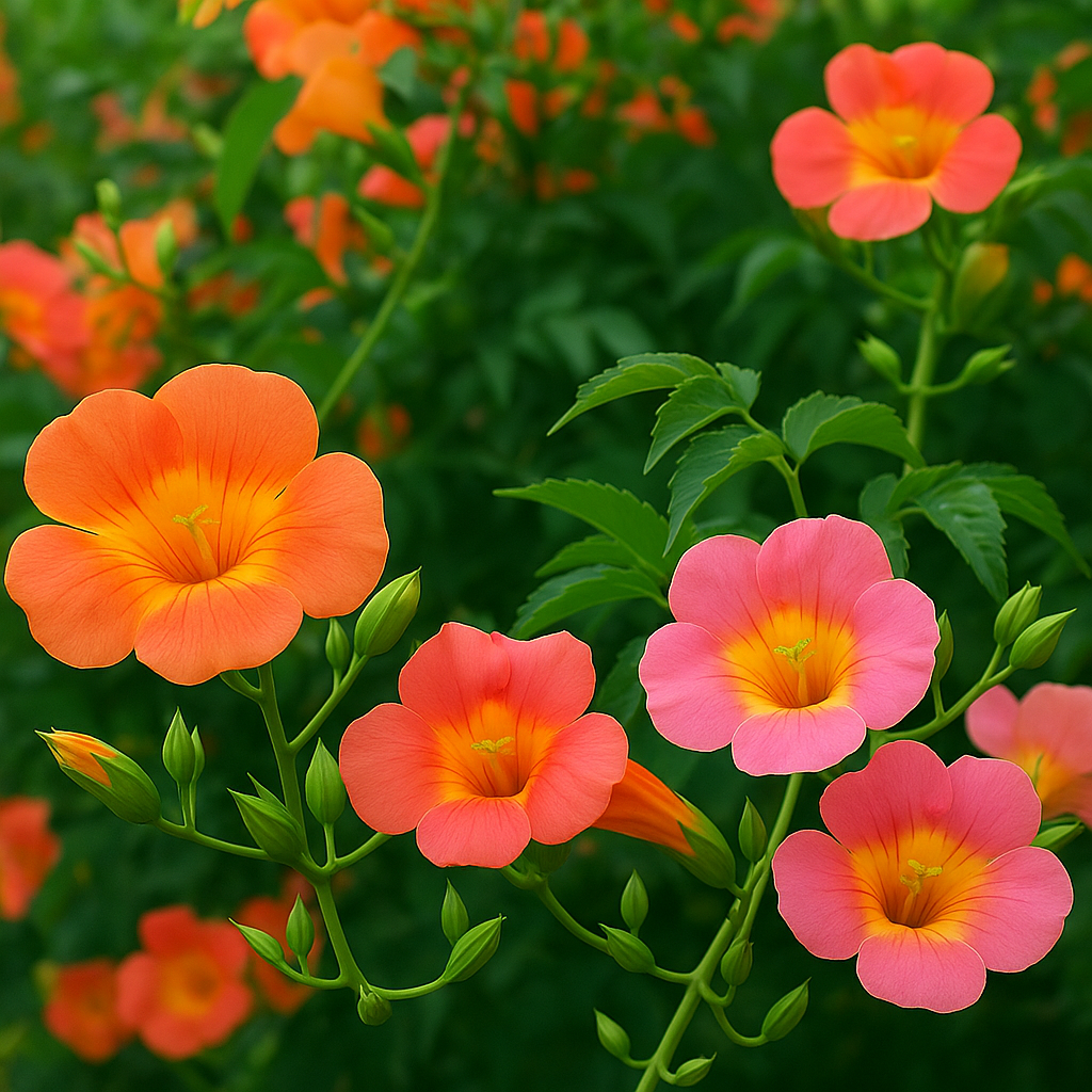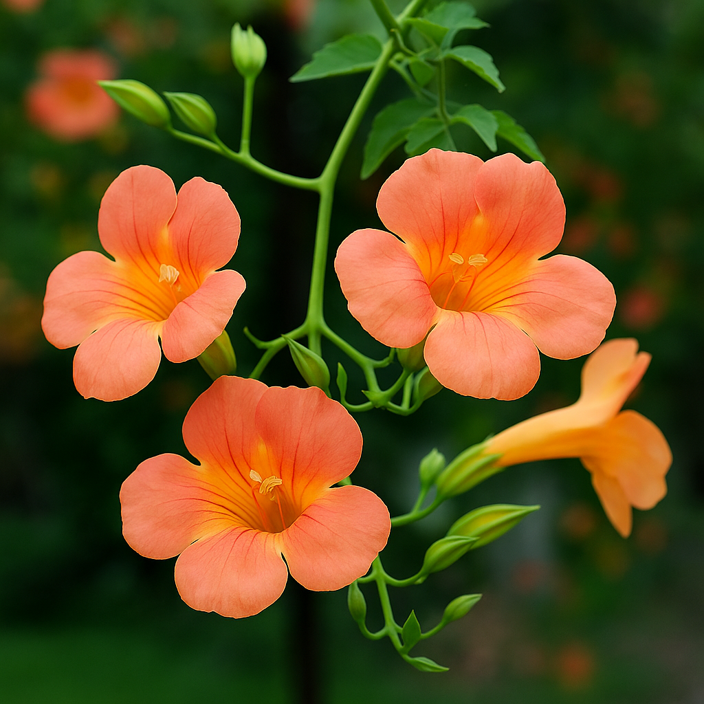 능소화(Campsis grandiflora)는 여름철 주황빛 꽃으로 담장을 수놓는 대표적인 덩굴식물입니다. 담장과 아치, 전통가옥과 잘 어울려 정원용으로 많은 사랑을 받고 있습니다.