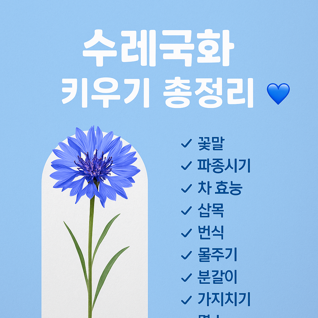 - 수레국화는 1년생이라 분갈이는 필수는 아니지만, 실내에서 장기 관리할 경우 봄마다 새 흙으로 교체하세요.