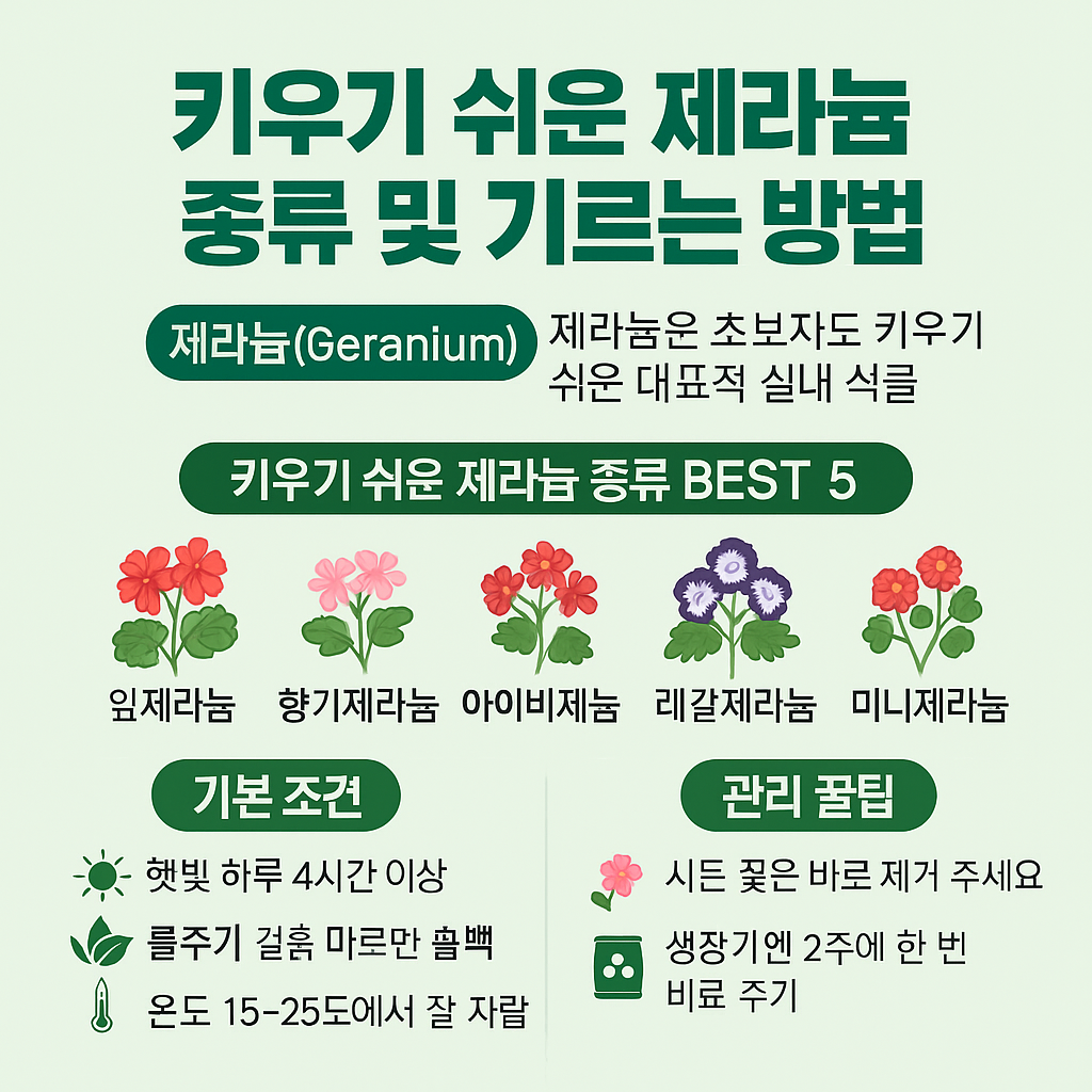 화사한 색감과 향기로 많은 사랑을 받는 제라늄(Geranium)은 초보 가드너도 쉽게 키울 수 있는 대표적인 실내 식물입니다. 이번 글에서는 키우기 쉬운 제라늄 종류와 건강하게 기르는 방법을 소개합니다.