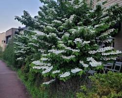 털설구화(Viburnum plicatum f. tomentosum)는 인동과(Viburnaceae)에 속하는 낙엽성 관목으로, 5~6월경 가지 끝에 하얀 꽃이 층층이 피며 멀리서 보면 마치 눈이 내린 듯한 인상을 줍니다. 가을에는 붉은 열매가 열리고, 단풍이 들어 사계절 내내 관상가치가 높은 식물입니다.