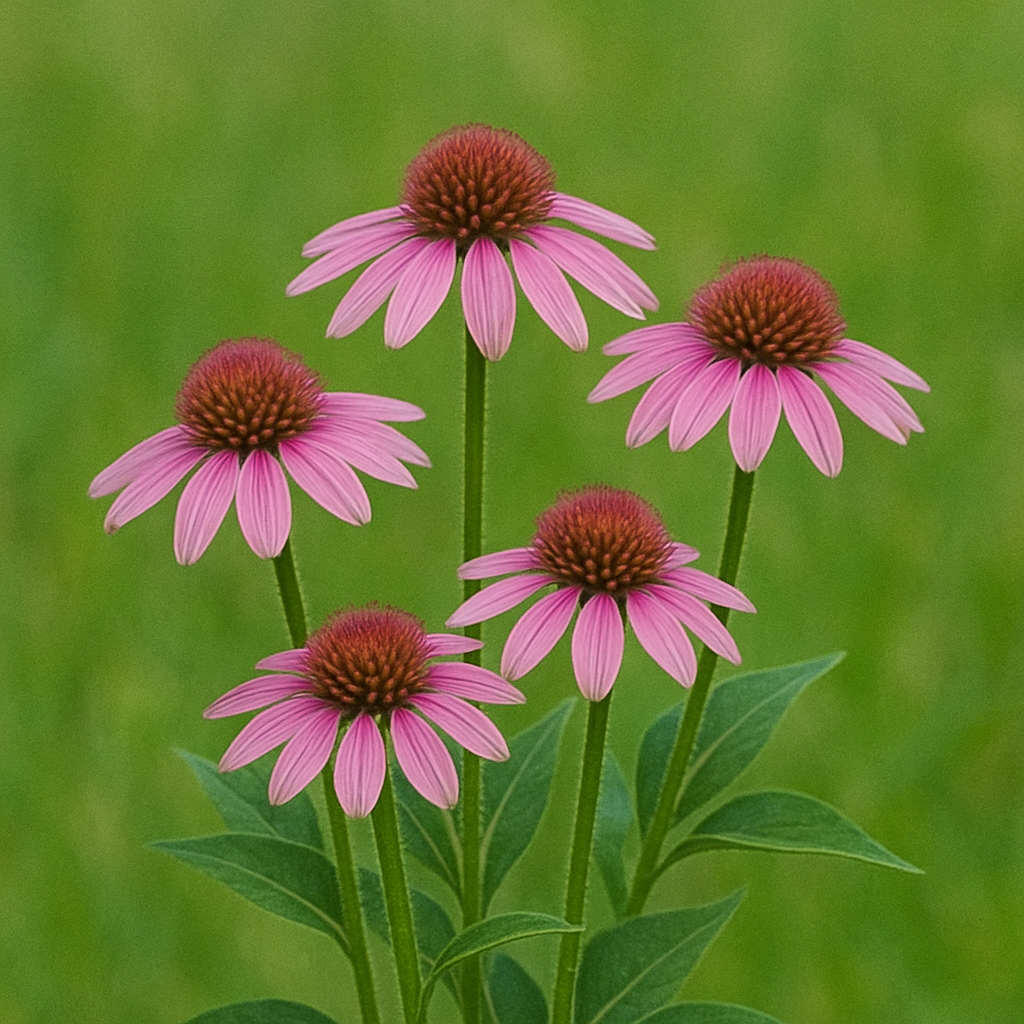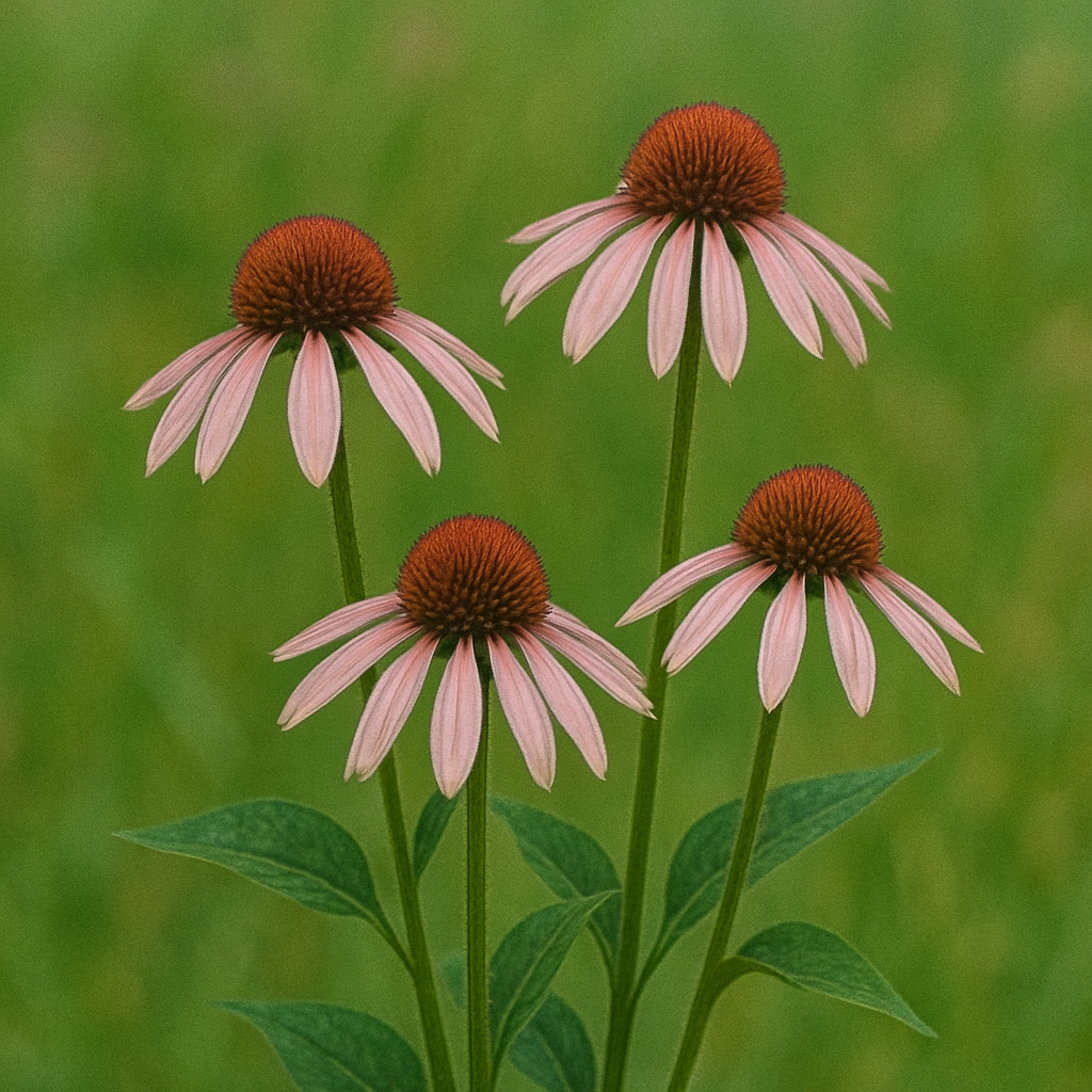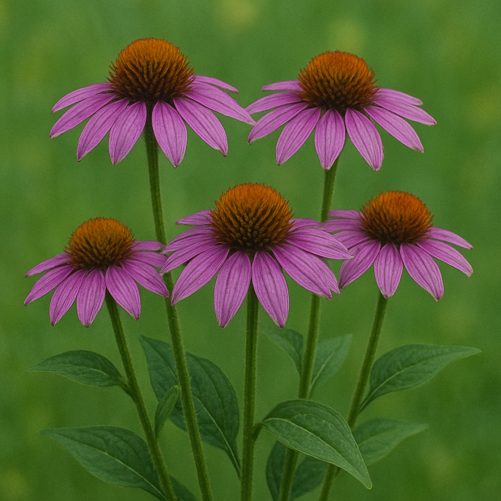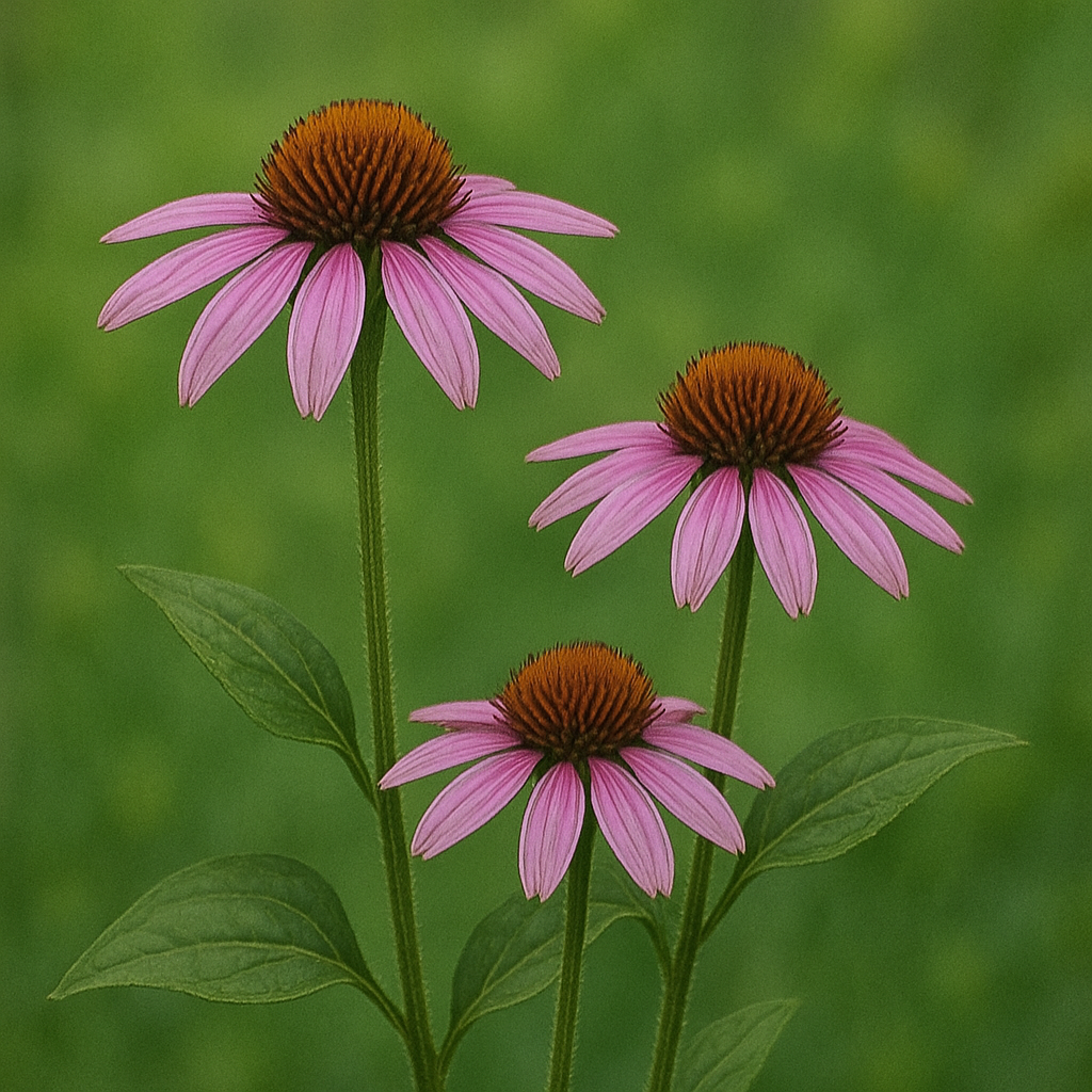 에키네시아는 북미 원산의 국화과 다년생 식물로, 예로부터 감기·독감 예방용 약초로 사용되어 왔습니다. 돔처럼 솟은 중심과 길게 뻗은 꽃잎이 특징이며, '자홍색 원추화(Purple Coneflower)'로도 불립니다.